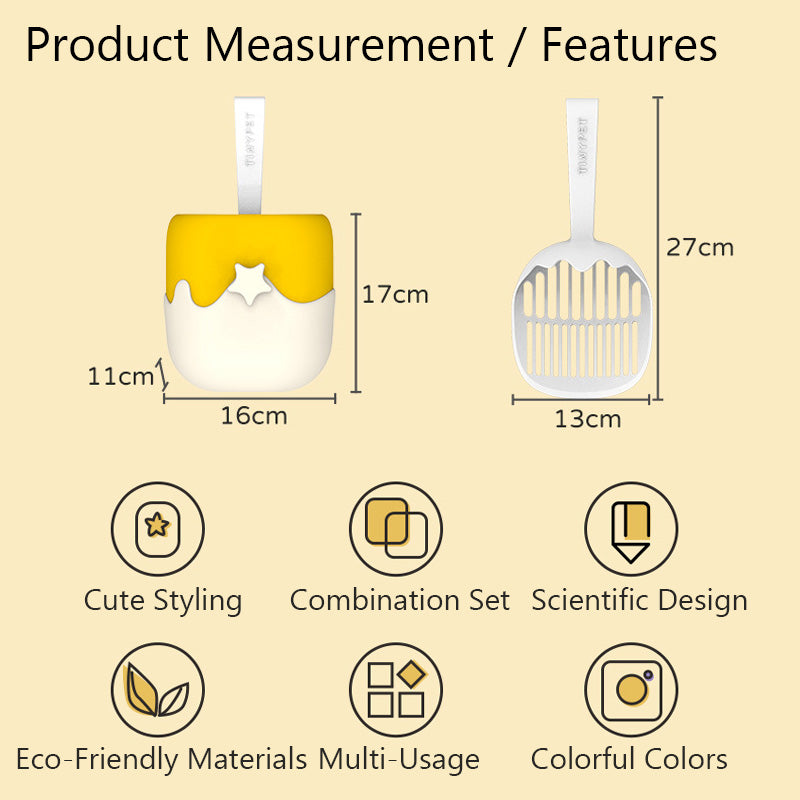 Our Cat Litter Scoop Set is the perfect addition to your cat's litter box routine. The scoop is designed with a round shape and candy-colored features, while the accompanying box can also be used as a litter bin.